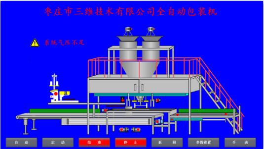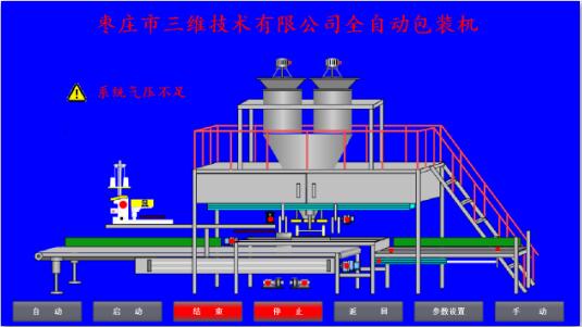 如出現(xiàn)圖中報警信息時,在處理完報警內(nèi)容并且沒有報警信息后,點擊“自動”按鈕,或外部旋鈕選擇,此時“自動”按鈕顯示為亮綠色,提示切換完成,按儀表啟動按鈕,啟動稱料系統(tǒng),點擊屏幕或外部“啟動”按鈕,設備啟動時首先經(jīng)過6秒左右的初始化,報警燈伴隨聲光報警,提示相關人員設備啟動,套袋擺臂執(zhí)行一個抬起落下動作,以回到準備位置,抱袋小車如不在準備位置則回到準備位置。初始化完成后,屏幕上啟動按鈕亮起,設備進入正常工作狀態(tài)。